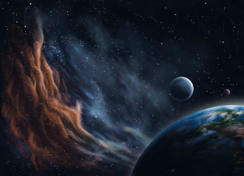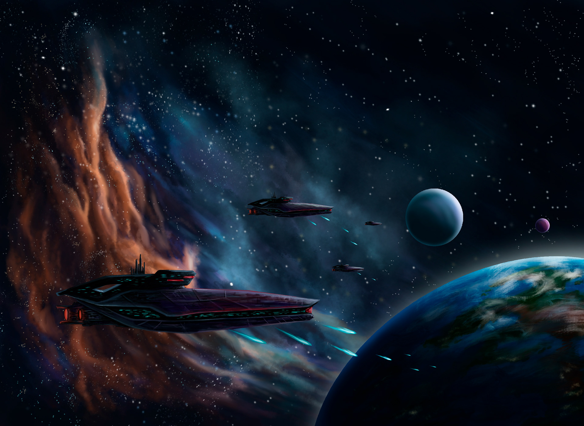 An animated Illustration showing a scene of battleships arriving to a planet.