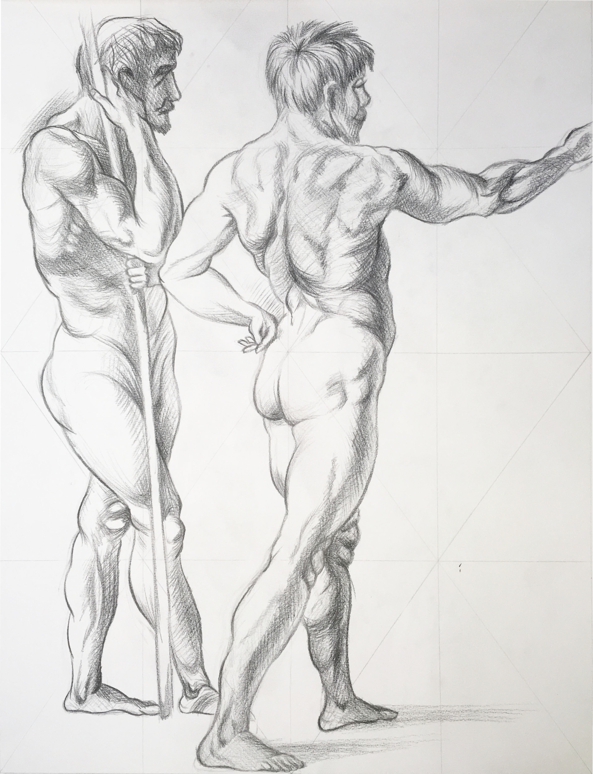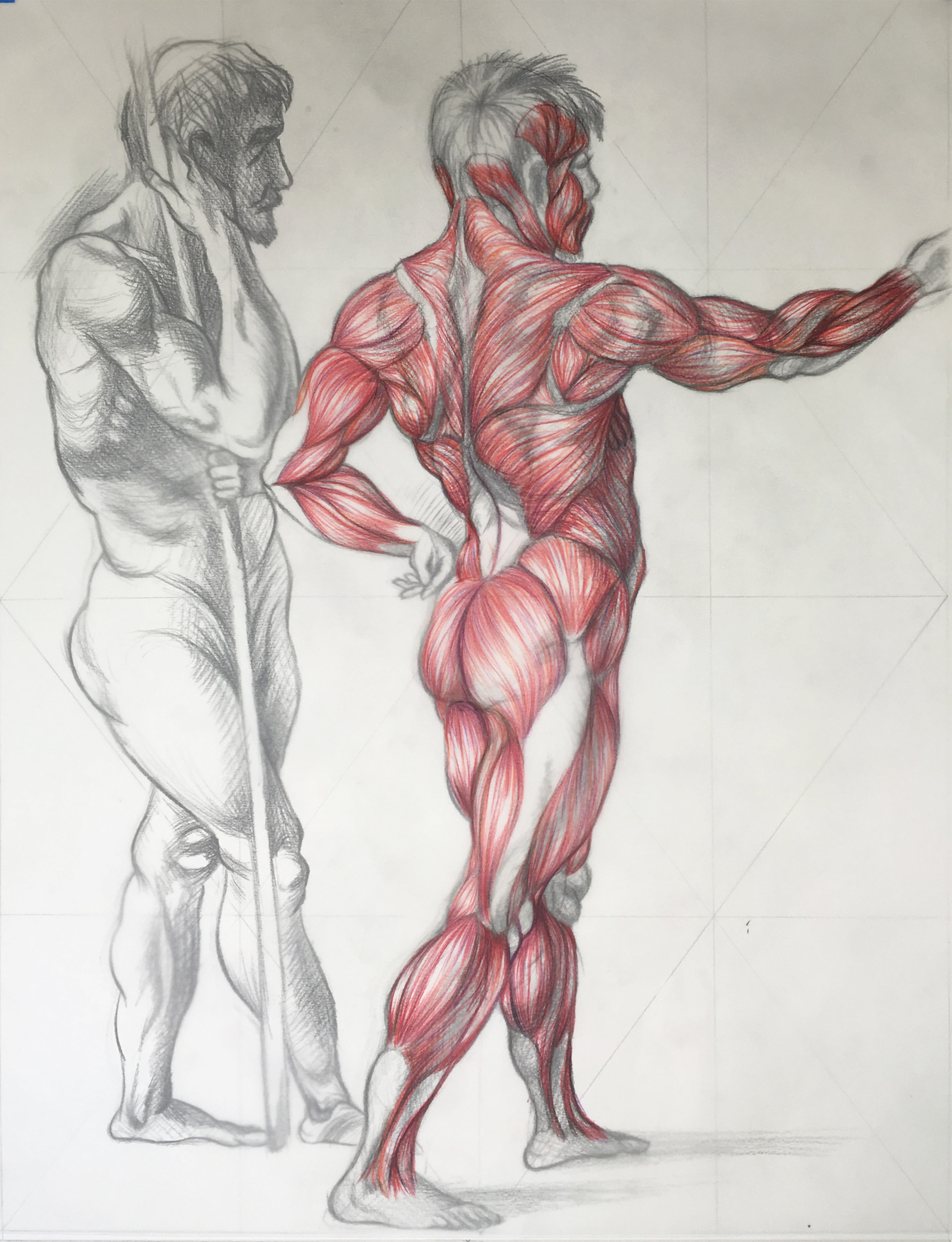 This was a Study of anatomy exercise to analyze one of the old grandmasters anatomic sketches. The first step was to choose one of the old master's sketches and then to draw on top of it the muscles with colored pencils.